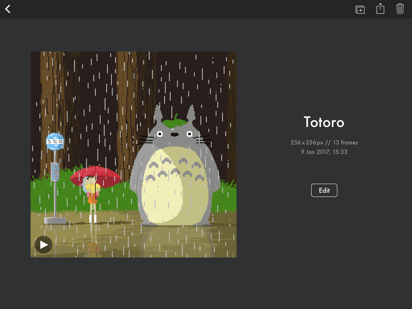 Tapping on any document in the gallery will take you to the artwork details screen. This screen shows more information about the selected document, and provides options for sharing and editing. Underneath the document name is displayed the resolution, the number of frames of animation, and the date and time that the document was last modified.