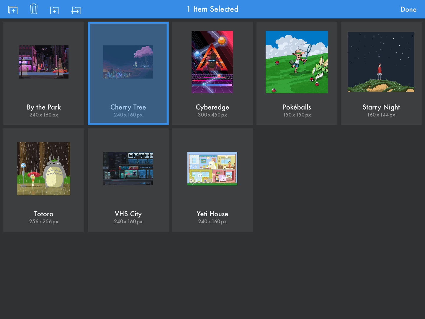 Import allows you to import Pixaki files, animated GIFs, layered PSDs, and many other image formats to be edited in Pixaki.